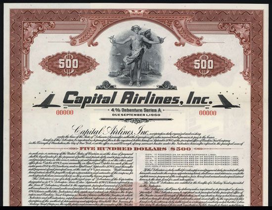 Delaware, 1949, $500, 4% Debenture, Specimen Bond, Black on brown border and underprint, God of Mercury standing top center holding a caduceus in right and hand and winged wheel in left hand with U.S. capitol building and large city behind him, VF condition, ABNC.