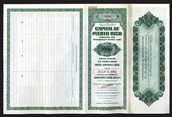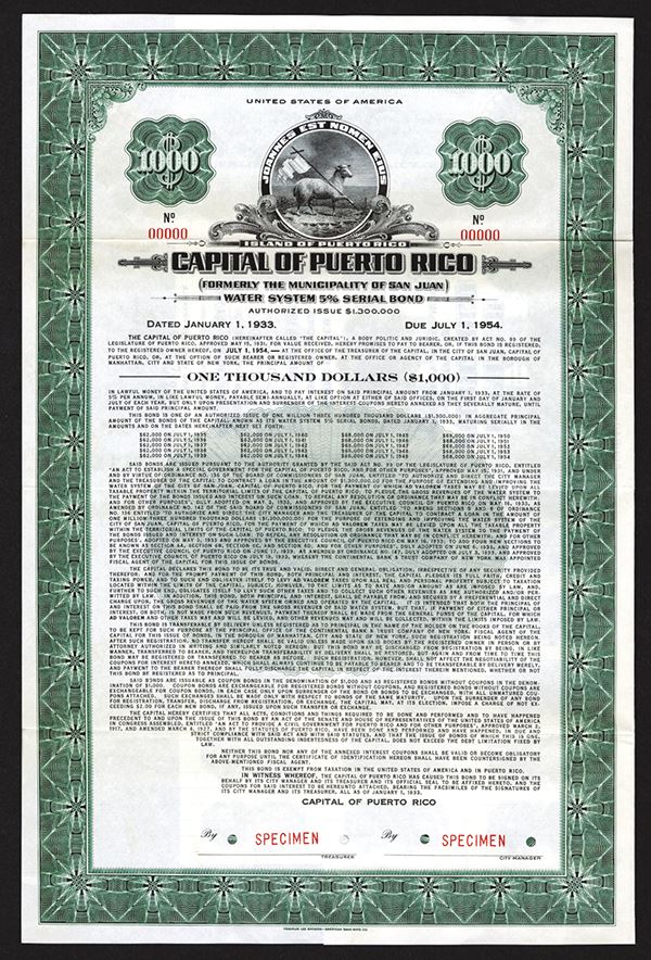 San Juan, Puerto Rico. Specimen bond. $1000. Water System 5% Serial bond. Coupons attached. Green border. Arms of Puerto Rico with sheep. Red Specimen overprint. ABNC. Scarce.