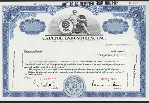 New York, 1973, Odd Shares, Black on blue border and underprint, Company logo with allegorical woman top center, Red SPECIMEN overprint and POC's, VF-XF condition, SCBNC. Well known record company with famous circular building in Hollywood, California.