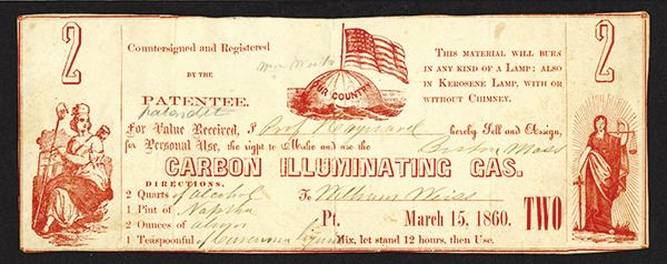 United States. Certificate with ingredients for gas lamp, with additional instructions on back. Very Fine.
