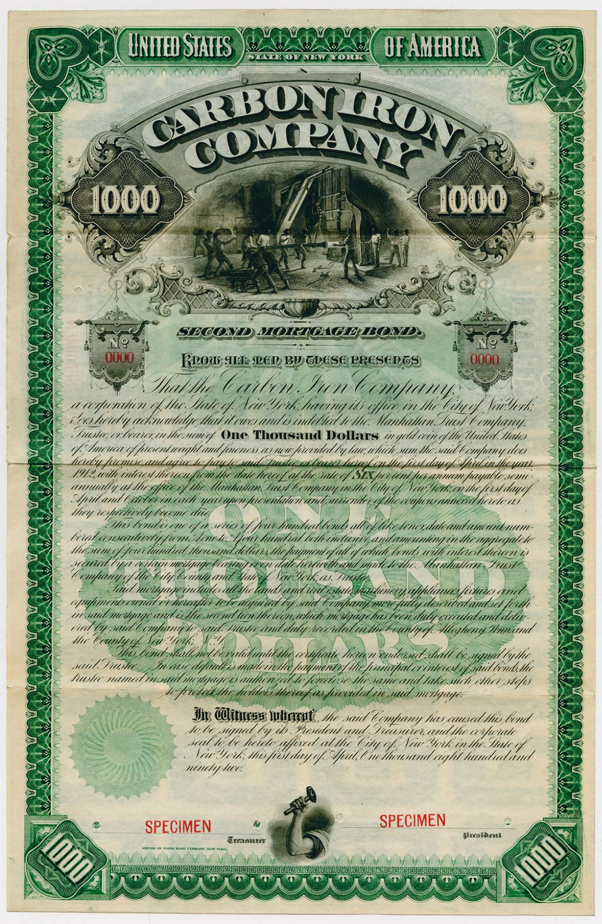 New York. $1,000 Specimen 6% Second Mortgage Coupon Bond, Black print on green border and under tint, Men in smelting factory at top, Specimen overprints and POC's, Fine-VF condition with toning at edges, ABNC. Early steel and coal company.