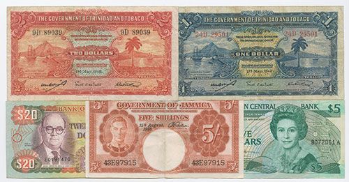 Lot of 5 notes. Includes 2 notes from Jamaica, 2 from Trinidad and Tobago and 1 from the Eastern Caribbean Central Bank, Highlights include Jamaica, 1958, 5/-, P-37, Choice VF and Trinidad and Tobago, 1942, $2, Choice Fine to VF.
