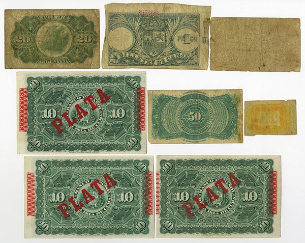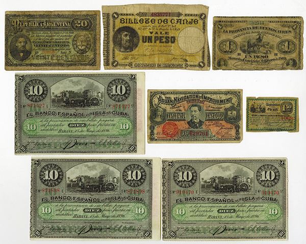 Lot of 8 notes, Includes Puerto Rico, 1895 Billete De Canje, Ministerio de Ultramar, 1 Peso, P-7b, Choice VG with a small 3 mm tear in the top excess margin away from design; Cuba, 3 examples of 1896, 10 Pesos "Plata" overprint, AU to Uncirculated; Argentina, 20 centavos, 1890, VG; Argentina, 1869, 1 Peso, Provincia De Buenos Ayres, 1869 , VG and Honduras, 1886, 50 centavos, P-S101, Fine with 3 mm tear on the upper right margin. Also includes a bond coupon from Peru, ca. 1869. Attractive assortment.