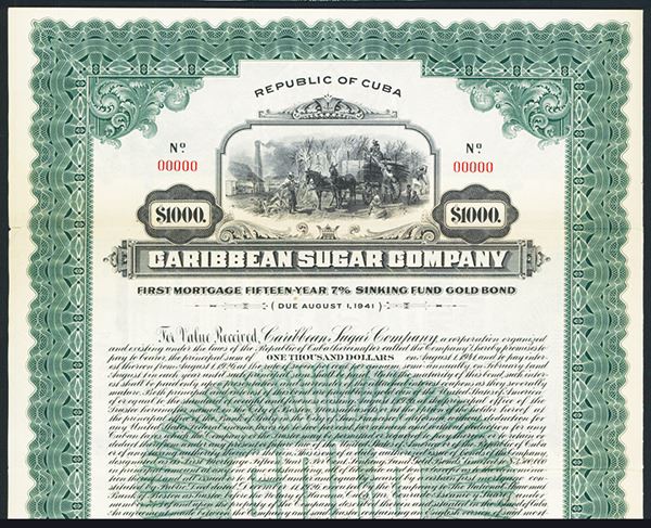 Cuba, 1926, $1000, 1st Mortgage 15 Year 7% Sinking Fund Gold Specimen Bond, Black on green border and underprint, Vignette top center of farmers harvesting sugar cane and loading up a large horse drawn cart, VF-XF condition, FLBNC.