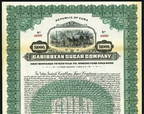 Cuba, 1926, $1000, 1st Mortgage 15 7% Sinking Fund Gold Specimen Bond, Vertical format, Coupons Attached, Blank print on green border and underprint, Sugar Cane farmers farming top center, Red SPECIMEN overprints and POC's, VF condition, FLABNC.
