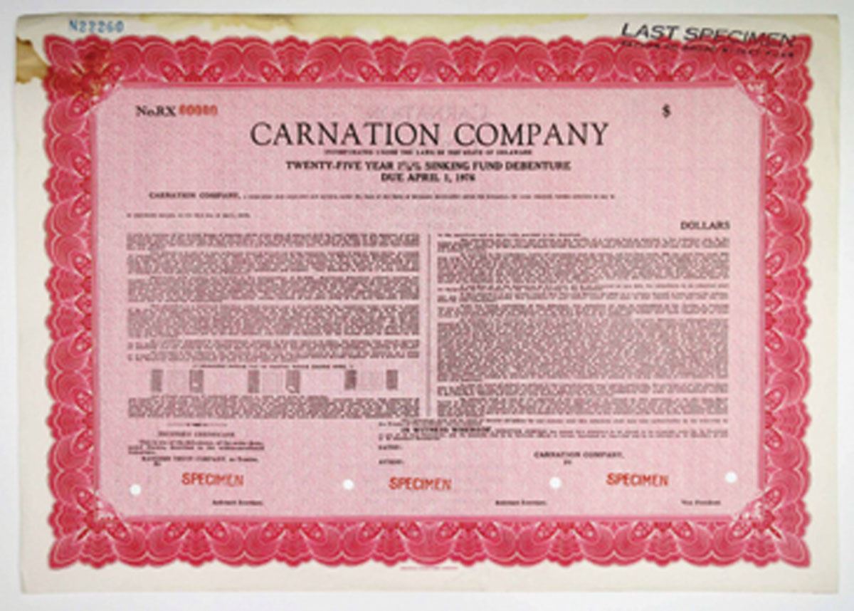 Carnation Co., 1950s $Odd Specimen 2 7/8% Sinking Fund Bond, Fine-VF ABN Red. 25-Year Sinking Fund Debenture Bond. Carnation is a brand of food products. The brand was especially known for its evaporated milk product created in 1899, then called Carnation Sterilized Cream and later called Carnation Evaporated Milk. The brand has since been used for other related products including milk-flavoring mixes, flavored beverages, flavor syrups, hot cocoa mixes, instant breakfasts, corn flakes, ice cream novelties, and dog food. Nestle acquired the Carnation Company in 1985.