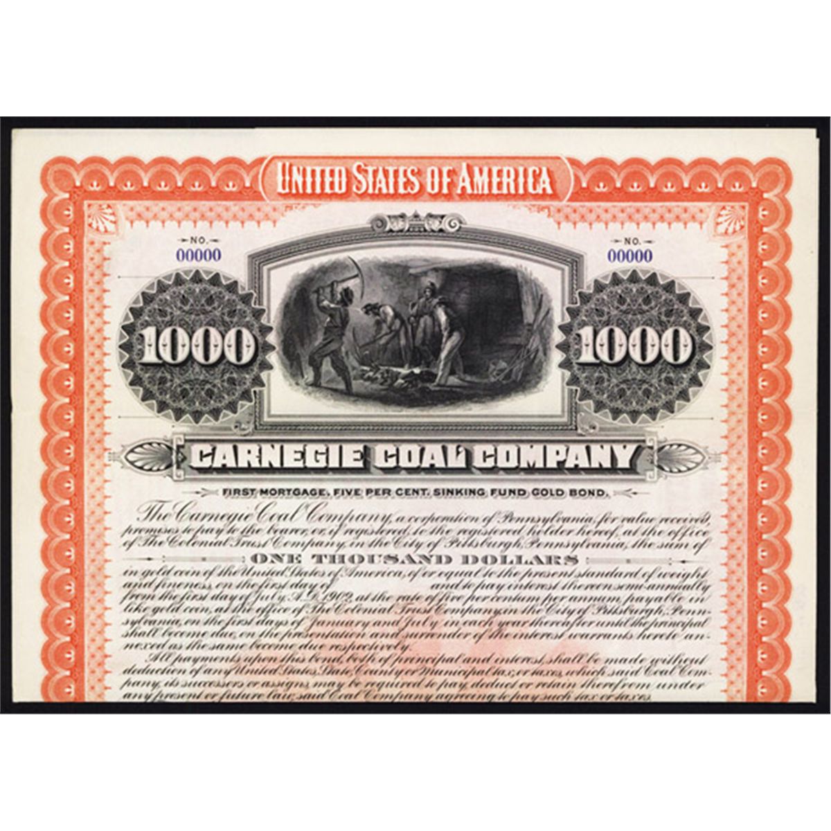 Pennsylvania, 1902, $1000, 1st mortgage 5% Gold Bond Specimen, Black on orange-red border and underprint, miners on top, coupons attached, Specimen overprints, POC's, XF condition. ABNC.