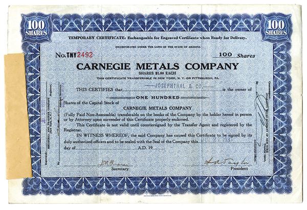 Arizona. Pair of 100 Shares I/U Temporary Capital Stock Certificates, Black text with blue border and background. Fine condition, RBN.