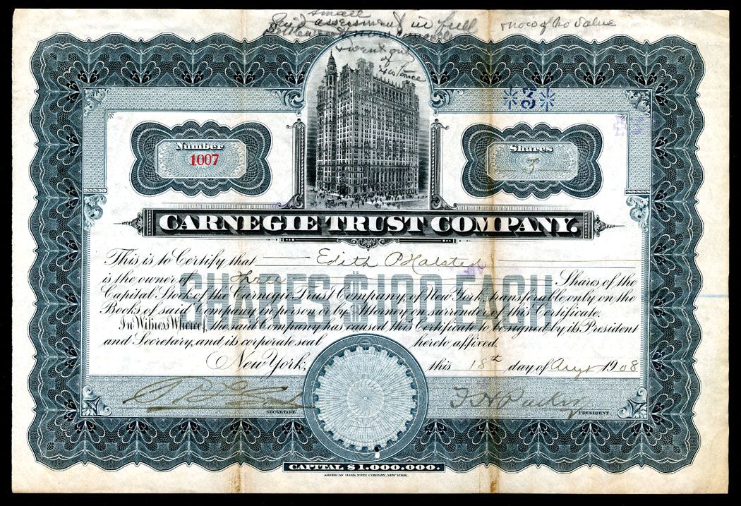 New York, 3 Shares, I/U, Black on blue border and underprint, impressive bank building on top, notations on top about value of shares and that company went out of existence. ABNC.