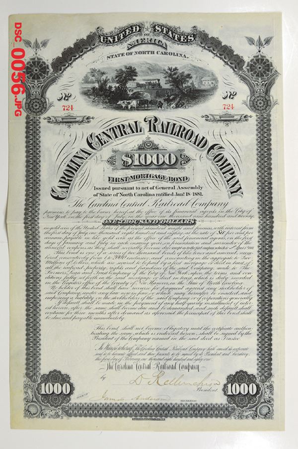 North Carolina. $1000 Issued 6% 1st Mortgage Coupon Bond, Black print on ornate black border and under tint, Image of train crossing bridge with animals drinking from river in foreground, VF-XF condition, ABNC.