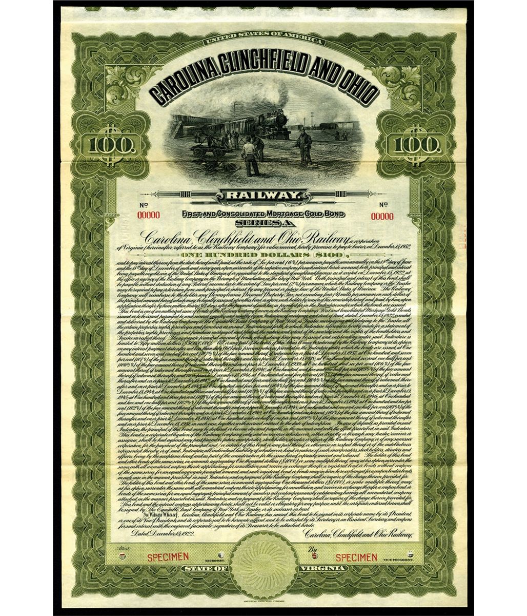 Virginia. $100. 1st and Consolidated Mortgage 6% Gold Bond. Series A. Olive green border and undertint. Train workers in yard with locomotive in background. VF condition. Red "Specimen", "00000" serial numbers and POC's. Unlisted railroad denomination in Cox. ABNC. Rare.