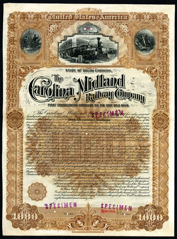 Carolina Midland Railway Co., 1891 Specimen Bond. South Carolina, $1000, Specimen 1st Consolidated Mortgage 6% Gold Bond. Brown border. Train at station in middle, miners at left and right over ornate title. Purple and red specimen overprints, POC's and "00000" serial numbers. XF condition. Rare and attractive certificate. Listed railroad in Cox. Unique in archive. This is the example listed in Cox.
