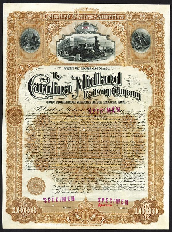 South Carolina, $1000, Specimen 1st Consolidated Mortgage 6% Gold Bond. Brown border. Train at station in middle, miners at left and right over ornate title. Purple and red specimen overprints, POC's and "00000" serial numbers. XF condition. Rare and attractive certificate. Listed railroad in Cox. Unique in archive. This is the example listed in Cox.