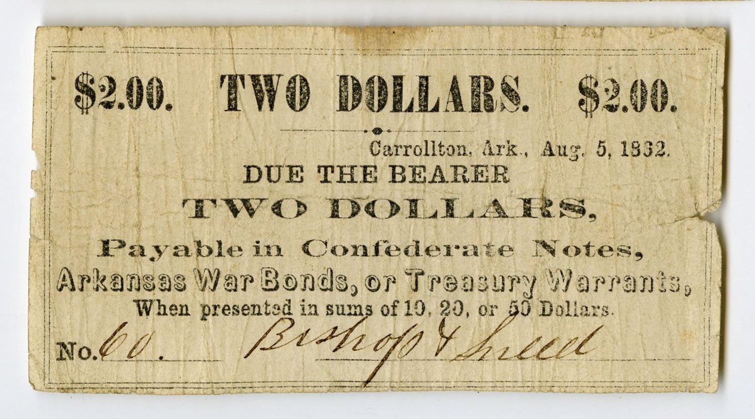Carrollton, Arkansas. August 5, 1862, Bishop & Snell. $2, Unlisted in Rothert, Issued obsolete scrip note, Dated August 5th, 1862, Printed text on face "Payable in Confederate Notes, Arkansas War Bonds, or Treasury Warrants", Black text, Denomination at top center, Signature at bottom right, S/N 60, VG to Fine to Choice Fine condition with some rough margins and toning. Only 1 other Carrollton issued note has appeared at auction.