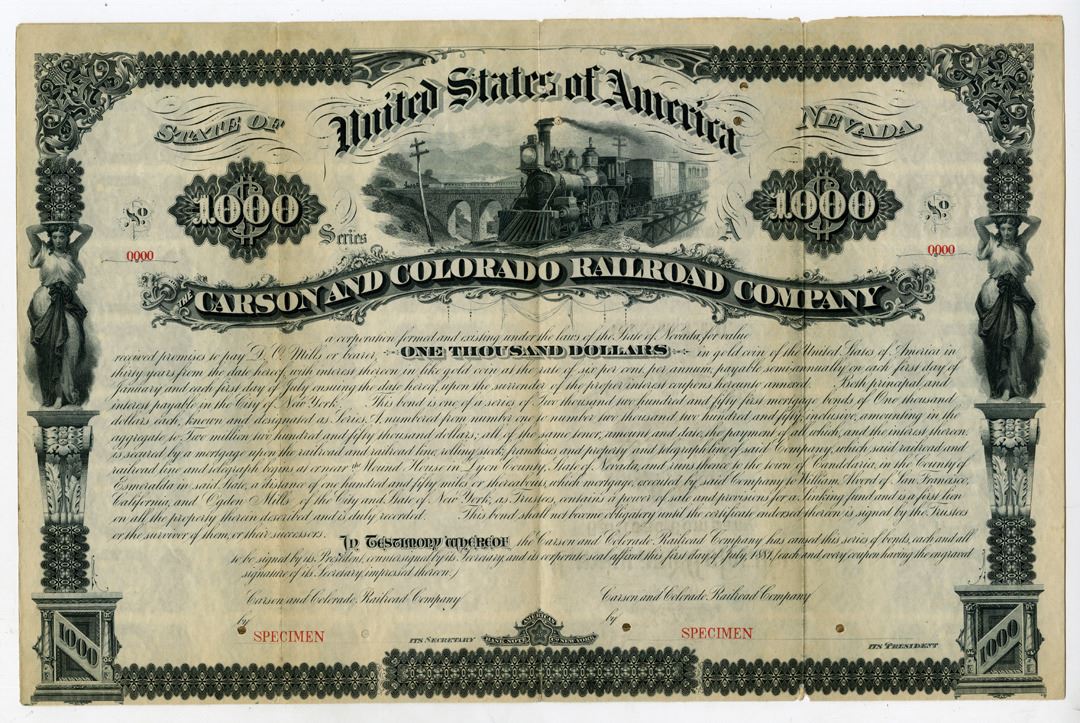 Nevada, July 1, 1881. Carson and Colorado Railroad Co., $1000 Specimen 6% First Mortgage Coupon Bond, Black printing with ornate black border, Locomotive with bridge in background over title, Allegorical women hold up columns on the left and right borders, horizontal format, coupons attached, Specimen overprints, "0000" serial numbers, and POCs, VF condition with minor splitting at folds archivally reinforced. ABNC. Only listed as a proof in Cox. This is very possibly unique. This is the first time this lovely bond has been offered at auction. It was discovered in 2002 in the ABN archives.