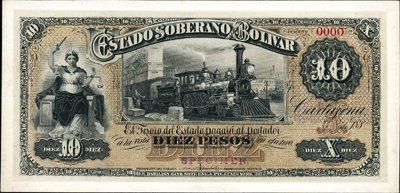 188- (ca.1885). P-S126 Trial Color Unlisted. 10 Pesos Face and back proofs printed on india on card. The face proof is a trial color in black on brown undertint (the issued note was black on orange undertint) and the back proof is in orange (the issued color for the back was brown). The face proof has a small purple "Specimen" handstamp on the middle bottom and the back proof has the "Specimen" overprint in the middle of the note. From a Hamilton Banknote Company salesman's sample book. Choice Unc. for both proofs. Rare note. Unique in archive. Hamilton BNC.