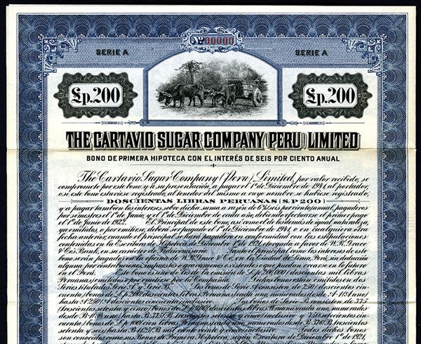 Peru. 1921. 200 Sol 6% Series A Specimen Bond. Black print with blue border and underprint. Vignette of oxen and cart top center. POC's and red SPECIMEN overprints. VF condition. ABNC.