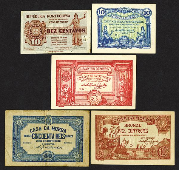 Portugal. 50 Reis; 5, 10, 50 Centavos. P-87 (Fine), 95b, 96, 97, 101 (light spotting). Generally Very Fine or better except where noted. 5 pieces.