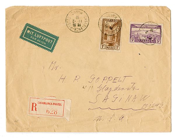 Morocco to Saginaw, MI. Envelope of a letter sent from Casablanca Morocco to a Mr. H.P. Goppelt in Saginaw, Michigan. Letter was probably from a Jewish person in Europe trying to contact family in America. The return address is listed as S.S. Columbus Pier 86, but the letter was indeed mailed from Casablanca.