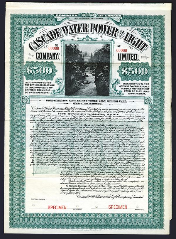 Canada, Province of British Columbia. $500 First Mortgage 4 1/2% Thirty Three Year Sinking Fund Gold Coupon Bond, green, river rushing through gorge, ABN Litho, Ottawa. EF.