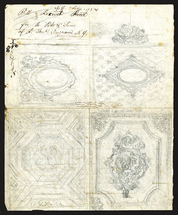 Detailed pencil drawings comprising what could be case designs done on back of ink letter. 8-1/2x10-3/8. Also, a sheet filled with a case design, lettering, and floral border doodles. 2 pieces.