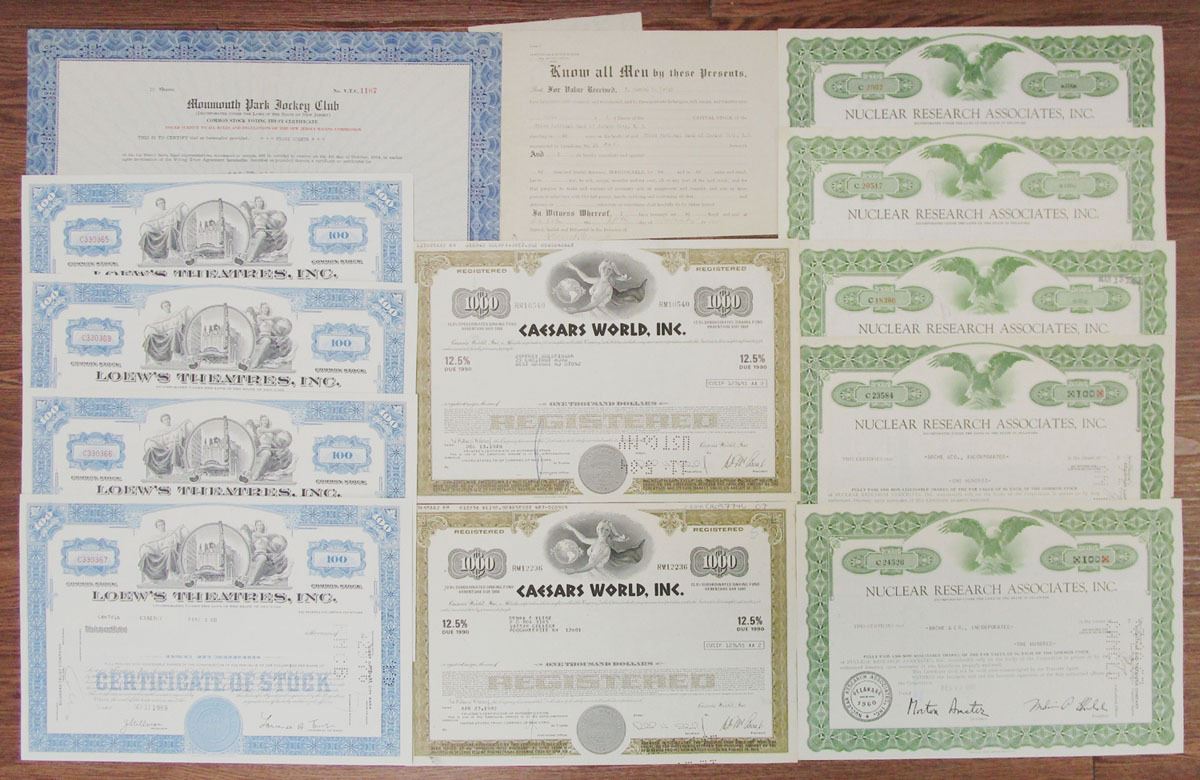 New Jersey, Delaware, Florida, & New York, 1945 to 1982. Lot of 13 Issued Stocks and Bonds, Includes: Caesars World, Inc., 1978-82, Pair of $1000 Registered 12.5% Bonds; Loew's Theatres, Inc., 1969, 100 Shares Common Stock Certificates (4); Nuclear Research Associates, Inc., 1961-67, Various Share Amount Common Stock Certificates (5); Monmouth Park Jockey Club, 1945, 10 Shares Stock Certificate; and Third National Bank of Jersey City, 1914, Stock Transfer/Sell Paper for 3 Shares. Condition ranges from Fine to XF. (13). Sold "AS IS" no returns accepted.