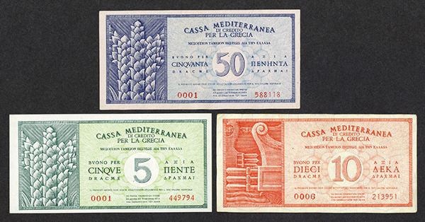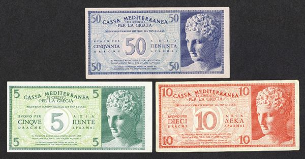 Greek Islands. 5, 10, 50 Drachmai. P-M1, M2, M3. First and Last Choice Uncirculated, the 10 is EF. Bold watermarks on all. 3 pieces.