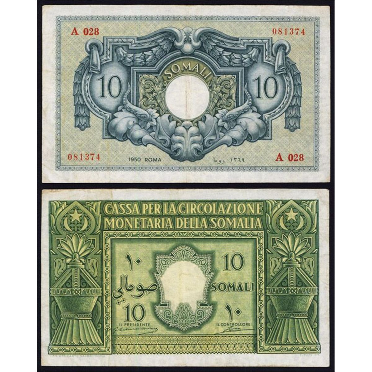 Italian Somaliland, 1950, 10 Somali, P-13a, Issued, Green and yellow, serial #A 028081374, VF Condition, attractive and rare note.