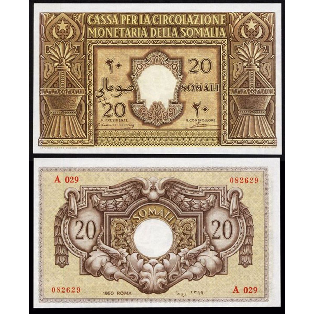 Italian Somaliland, 1950, 20 Somali, P-14a, Issued banknote, Brown and yellow, The note is well centered and has bright fresh colors and sharp corners but it has evidently been pressed in the past and should grade Choice Fine to VF condition though it appears in XF+. Scarce note in any condition.