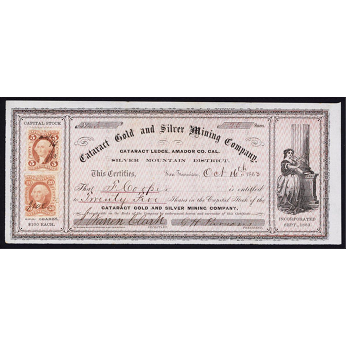 California, 1863, 25 Shs, Cert.#3, Issued stock, Black on pink underprint, Standing allegorical woman on right and 2 adhesive 2cts stamps on left, XF condition, Mines located at Cataract Ledge, Amador Co. Cal, Silver Mountain District, Scarce and early California mining stock certificate.