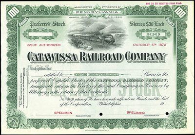PA. 19--(ca. 1900-1920). Specimen. 100 shs, Preferred Capital Stock, green. Vignette of speeding passenger train. Extremely attractive certificate. SBNC. XF.
