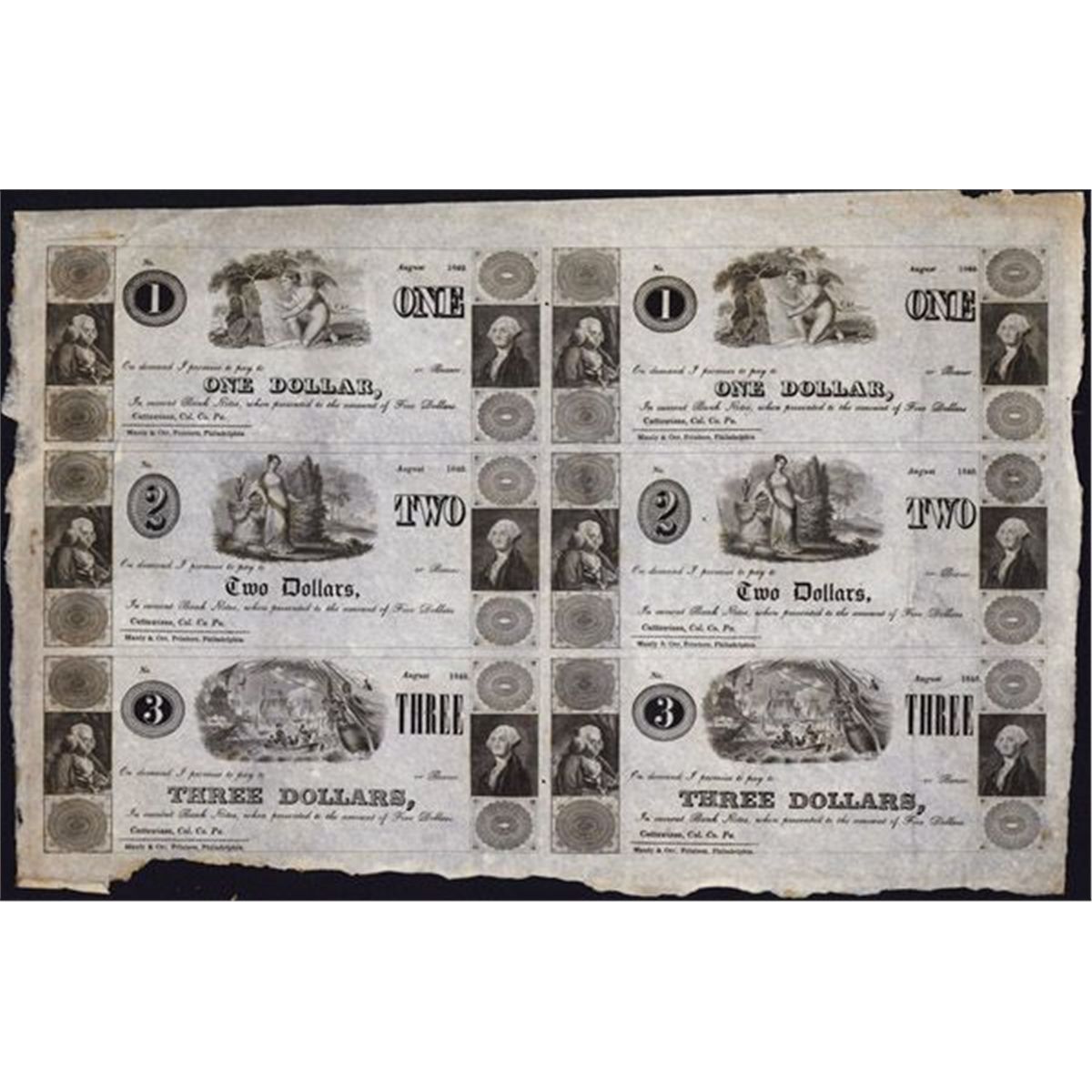 Cattawissa, Col.Co., Pennsylvania, Uncut sheet of 6 notes, P-Unlisted and Haxby Unlisted, $1-1; $2-2; $3-3, 2 vertical strips of 3 different notes, all have Penn and Washington flanking central vignette, the $1 has a mischievous cherub hiding behind wall; the $2 has standing allegorical woman with pitcher; and the $3 has men in rowboat with war ships in battle. Condition varies between Choice VF to AU condition. Manly & Orr, Printers, Phila.
