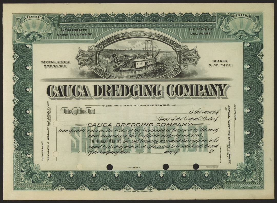 Colombia. (Inc. in Delaware), 19xx (1900-1910), Specimen Stock, Odd Shares, Black on green border and underprint, Dredging ship top center, Located on the Cauca River in Colombia. POC's, VF condition, SBNC.