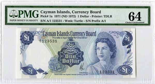 Cayman Islands, 1 Dollar, P-1a, PMG graded Choice Uncirculated 64, TDLR.
