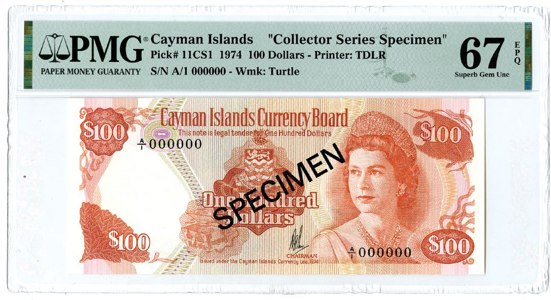 Cayman Islands... 1974. $100, P-11CS1, Specimen Banknote. Orange and m/c underprint with portrait of Queen Elizabeth II at right. Printer: TDLR. PMG graded Superb Gem Uncirculated 67 EPQ. Highest graded out of 4 graded in the PMG census.