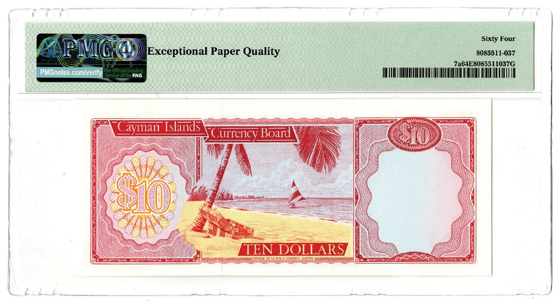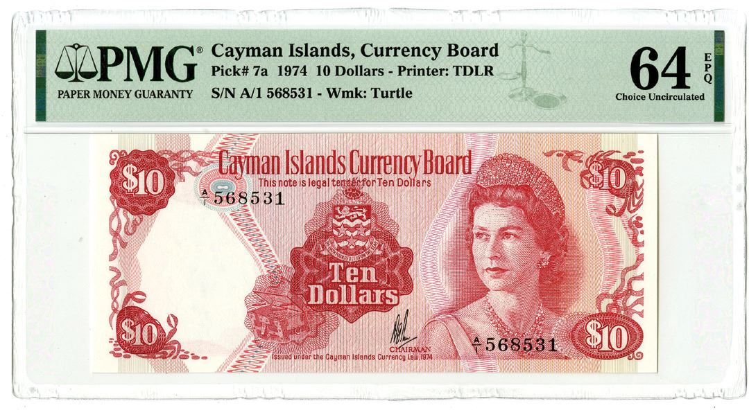 Cayman Islands. 1974. 10 Dollars, P-7a, Issued banknote, Dark red and light red, S/N A/1 568531, Watermark: Turtle, PMG graded Choice Uncirculated 64 EPQ.