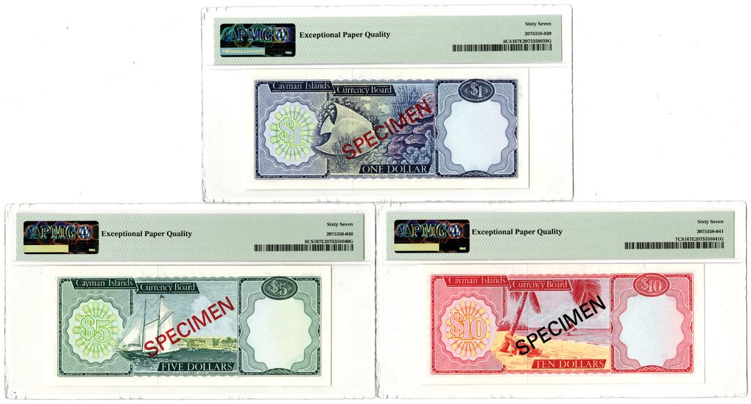 Cayman Islands.... 1974. Lot of 3 notes, All 3 are PMG graded Superb Gem Uncirculated 67 EPQ, all are the highest graded examples in the PMG census. Includes $1 (P-5CS1), tied with one other as highest graded out of 6 in the PMG census; $5 (P-6CS1), This is the highest graded note in the PMG census out of 4 graded; and, $10 (P-7CS1), tied with one other note as highest graded in the PMG census out of 5 graded. Printer: TDLR. (3)