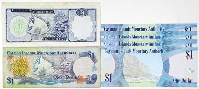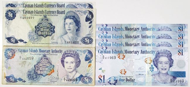 Cayman IslandsÉ Group of $1 bills includes; $1, 1971, P-1a (2), Blue on m/c underprint, arms at upper center, Queen Elizabeth II at right, TDLR; $1, 1998, P-21a, Purple, orange and deep blue on m/c underprint, Queen Elizabeth II at right, TDLR; $1, 2010, P-38a, Blue and violet on m/c underprint, Queen Elizabeth II at right, DLR; $1, 2014-2018, Unlisted notes (3), same as P-38, TDLR. Notes range from Fine-Choice. (7) (Sold "AS IS" No returns accepted)