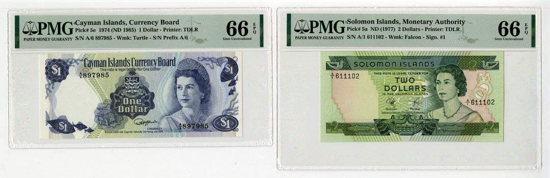 Cayman & Solomon Islands, ND (1977-85). Cayman Islands Currency Board & Solomon Islands Monetary Authority Pair of Issued Banknotes. $1, P-5e, Issued Banknote. Blue on m/c underprint with portrait of Queen Elizabeth II in tiara at right. S/N A/6 897985 Printer: TDLR; $2, P-5a, Issued Banknote. Dark green on pink and pale green underprint with portrait of Queen Elizabeth at right. S/N A/1 611102 Printer: TDLR. Both notes are PMG graded Gem Uncirculated 66 EPQ. (2).