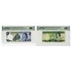 Cayman & Solomon Islands, ND (1977-85). Cayman Islands Currency Board & Solomon Islands Monetary Authority Pair of Issued Banknotes. $1, P-5e, Issued Banknote. Blue on m/c underprint with portrait of Queen Elizabeth II in tiara at right. S/N A/6 897985 Printer: TDLR; $2, P-5a, Issued Banknote. Dark green on pink and pale green underprint with portrait of Queen Elizabeth at right. S/N A/1 611102 Printer: TDLR. Both notes are PMG graded Gem Uncirculated 66 EPQ. (2).