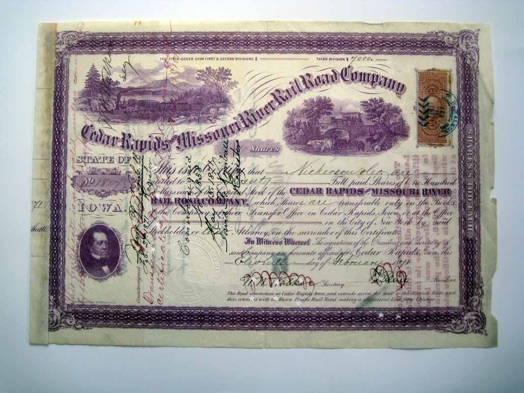 Iowa, 1871, Issued and Cancelled Stock, 40 Shares, #1807, Moving locomotive r-l top left and moving locomotive over bridge with cows below on top right, POC's, Fine condition, Snyder, Black & Sturn. Railroad and bond listed in Cox.