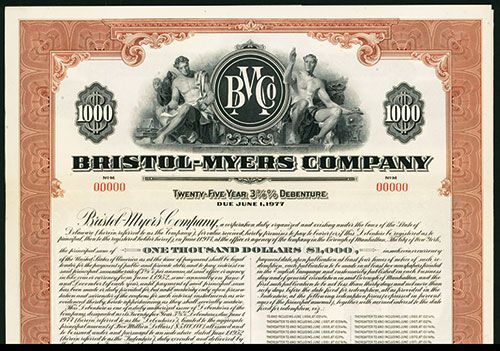 Delaware, $1000, 25 Year 3 3/8% Debenture, Specimen Bond, Black on brown border and underprint, Company logo top center flanked by two sitting allegorical men, Specimen overprint, POC's, coupons, VF-XF condition, ABNC. Bristol-Myers Squibb Is a pharmaceutical company based out of New York City.