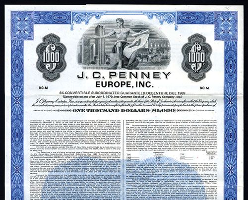 Delaware, 1969, $1000, 6% Convertible Subordinated Guaranteed Debenture Specimen, Black on blue border and underprint, Vignette top center of allegorical man between modern commercial buildings on the left and the original J.C. Penney store “Golden Rule Store” on the right, POC's, VF-XF condition, ABNC. Mid-range department store started in Wyoming by James Cash Penney.
