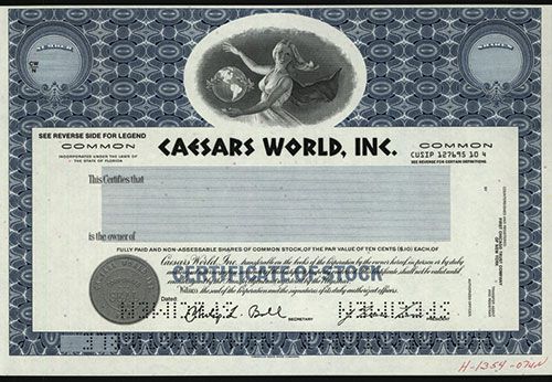 Las Vegas, Nevada. (Incorporated in Florida), ND (ca.1969-73), Specimen Stock certificate, Odd Shares, Black on blue border and underprint, Young woman with her hands below and above floating globe, Uncirculated condition, ABNC. Well known casino operator in Nevada, Lake Tahoe, Atlantic City and the Poconos.