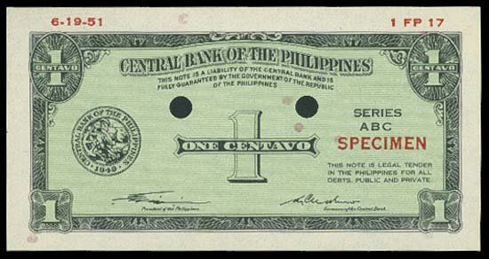 1949. P-Unlisted. Unique 1 Centavo in 4 different variations. Uniface front essay specimens or proofs. Red specimen overprints and POC's. No backs. Unreleased and unissued1 Centavo denominations. All are 65 x 30 mm. Black borders with either light green, light blue, light beige or no undertint. Faces have red overprints on upper top margins dated 6-19-51 and various other numbers. Backs have 6-19-51 date and other numbers printed on top margin in red. Face have line for approval signatures on back. Choice Uncirculated. Rare. SBNC.
