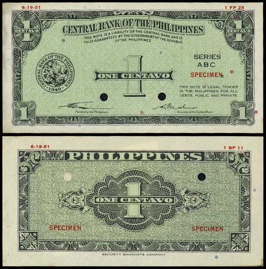 1949. P-Unlisted. 1 Centavo. Uniface front and back essay specimens or proofs. Red specimen overprint and POC's. Unreleased and unissued 1 Centavo denomination. 100 x 49 mm. Black border with light green undertint. Face has a red overprint on upper top margin dated 6-19-51 and 1 FP 25. Back has 6-19-51 date and 1 BP 11 printed on top margin in red. Face and backs have line for approval signatures on back. Choice Uncirculated. Rare. SBNC.