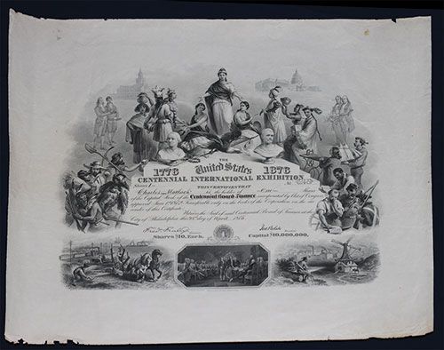 Philadelphia. 1875. I/U stock. 1 Share. #243, 25 x 22 inches. Amazing large format ornately engraved stock certificate. Upper vignette encompasses the entire U.S. history timeline from early settlers to the Civil War and the beginning of the Industrial Revolution. Lower left has vignette of farmers reaping by hand to modern plowing, the right vignette on bottom has Native American Progress vignette and the middle bottom has the signing of the Declaration of Independence. XF condition with lower right corner with small tears and rips very far from any design, otherwise this certificate is in exceptional condition. Issued to Charles Matlack. BEP.