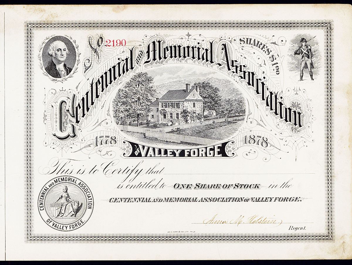 Pennsylvania, Valley Forge, 1878, One Share, Washington's Head Quarters, signed but not issued, pencil notations on the back, some light stains in the margins, otherwise VF.