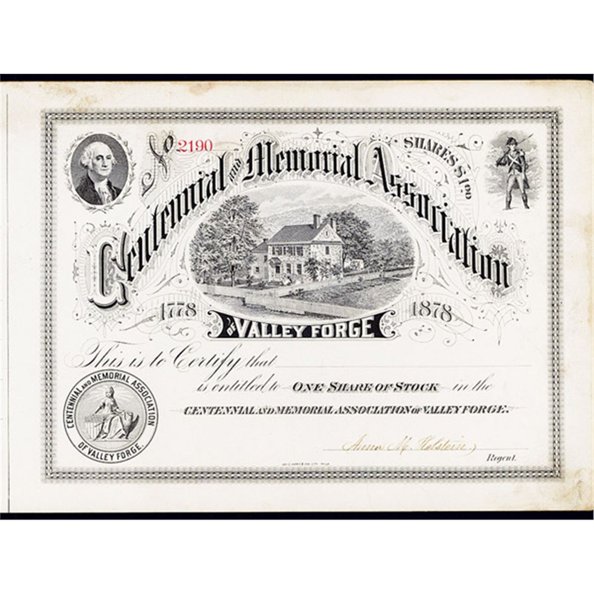 Pennsylvania, Valley Forge, 1878, One Share, Washington's Head Quarters, signed but not issued, pencil notations on the back, some light stains in the margins, otherwise VF.