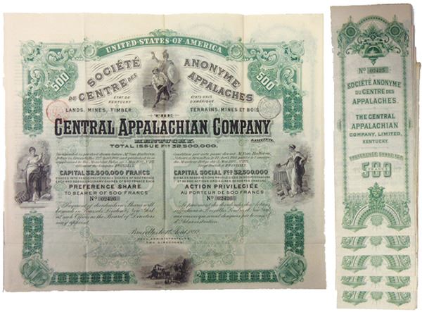 Kentucky. Lot of 6 bonds, All are 500 Francs, Black on green, Bi-lingual text, green, Mercury and miner, All VF.